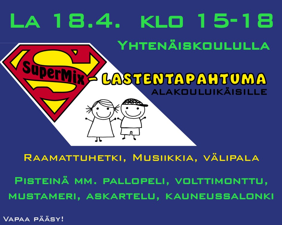SuperMix-lastentapahtuma on jälleen Yhtenäiskoululla 15.11.2025. Tapahtumia pidetään neljä kertaa lukuvuodessa ja ne on tarkoitettu alakouluikäisille lapsille SuperMix-tapahtuman aluksi kokoonnutaan yhteen… Lue lisää